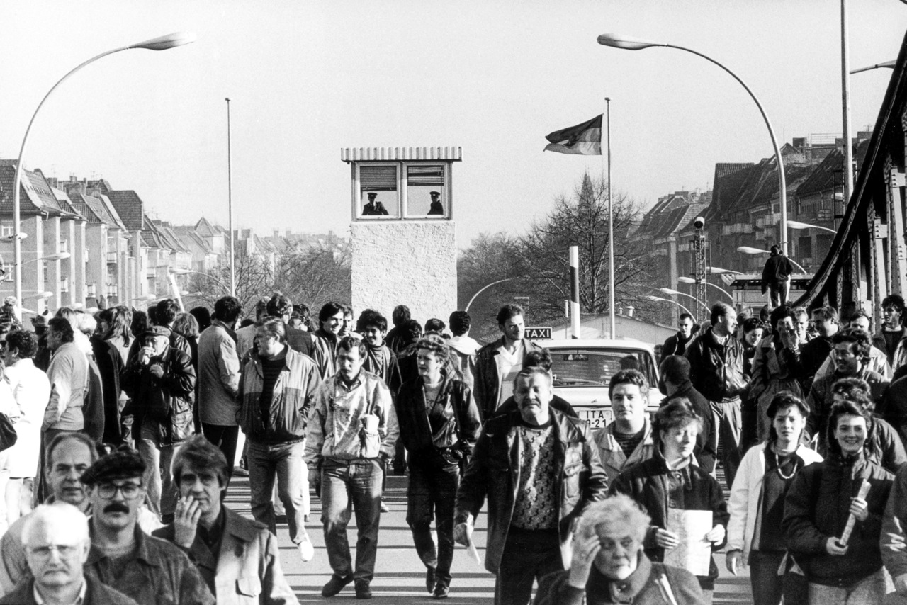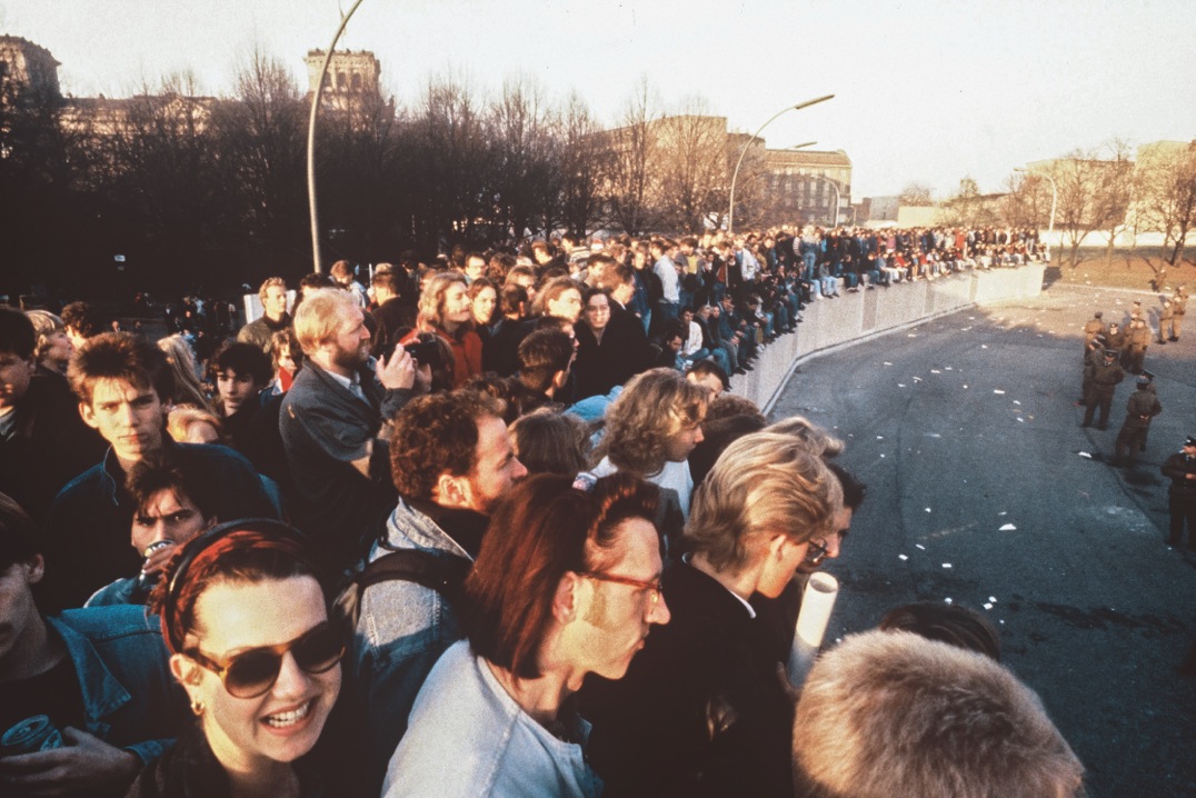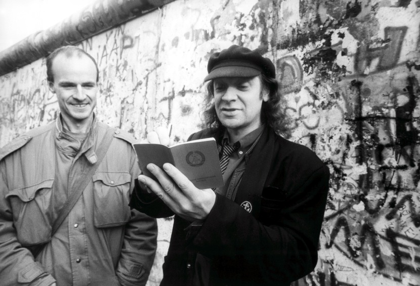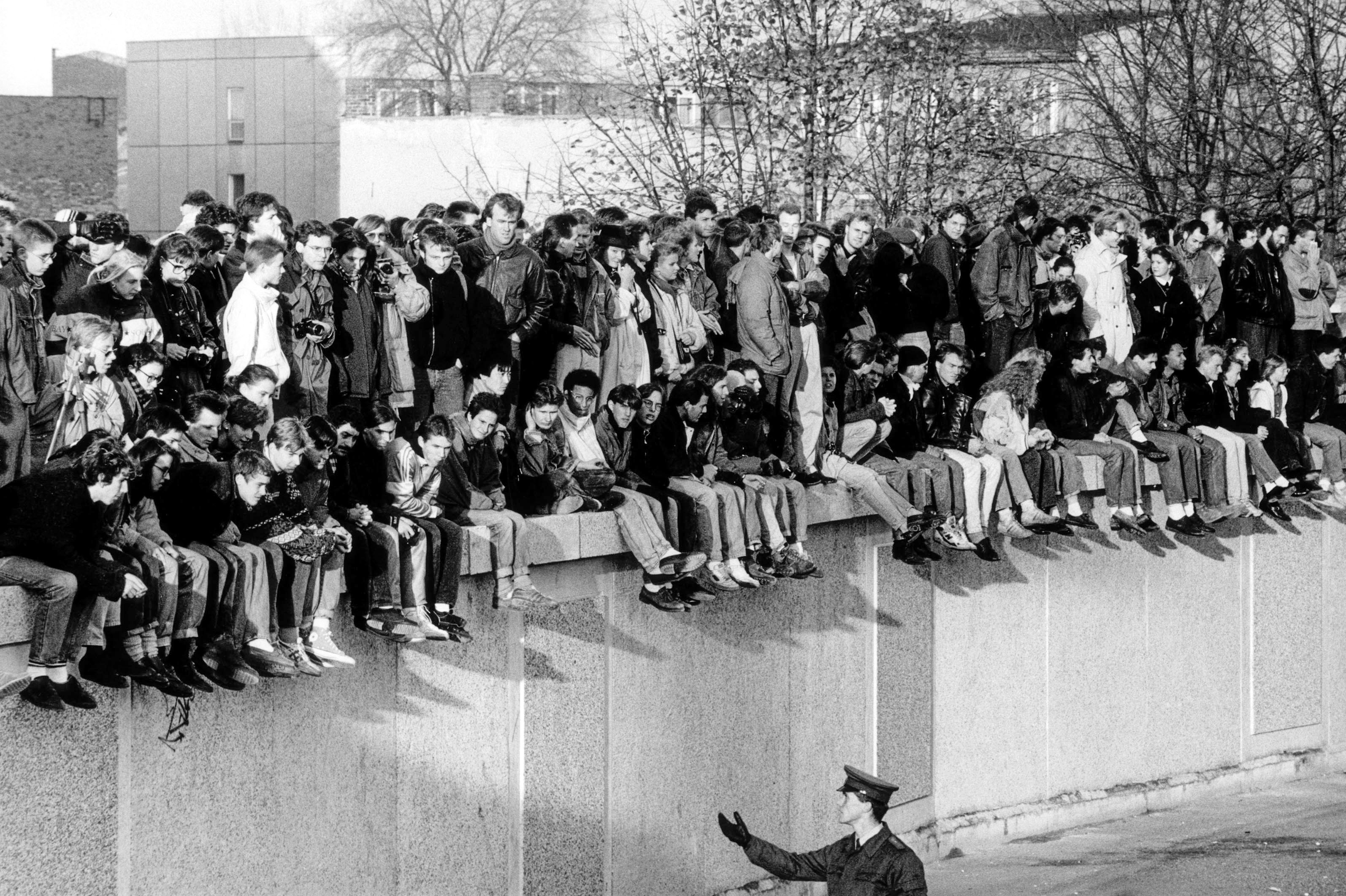 Berlin, 10.11.1989 Jugendliche ärgern die DDR Grenzbeamten am Tag nach dem Mauerfall